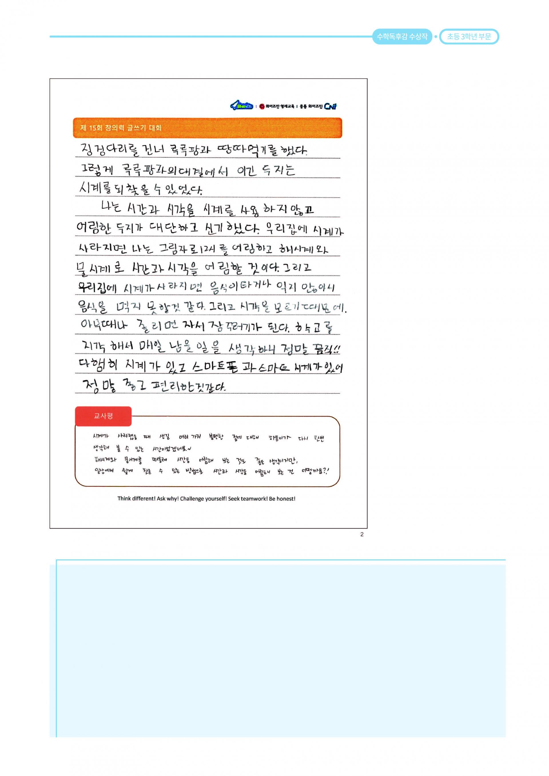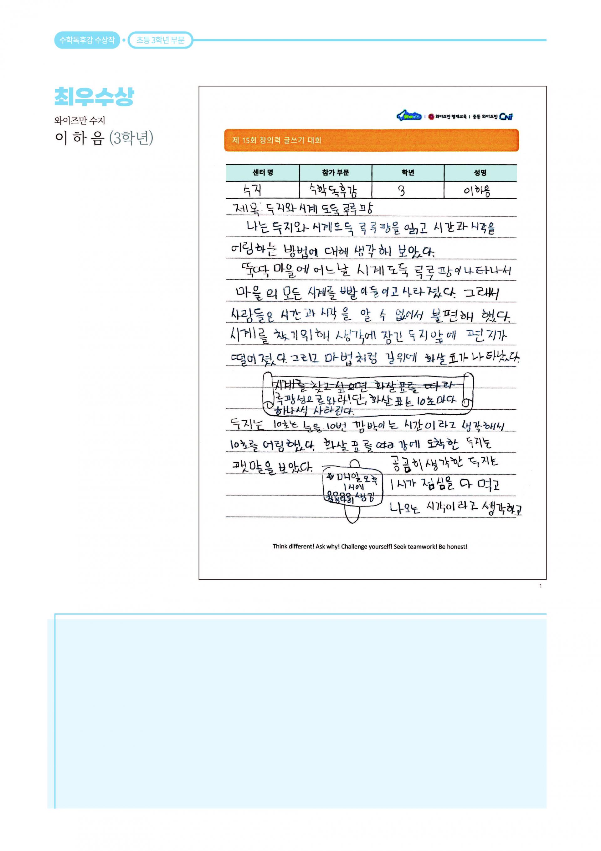 제 15회 창의력 글쓰기 대회 수학 독후감 최우수상 와이즈만 영재교육 수지센터 3학년 이하음