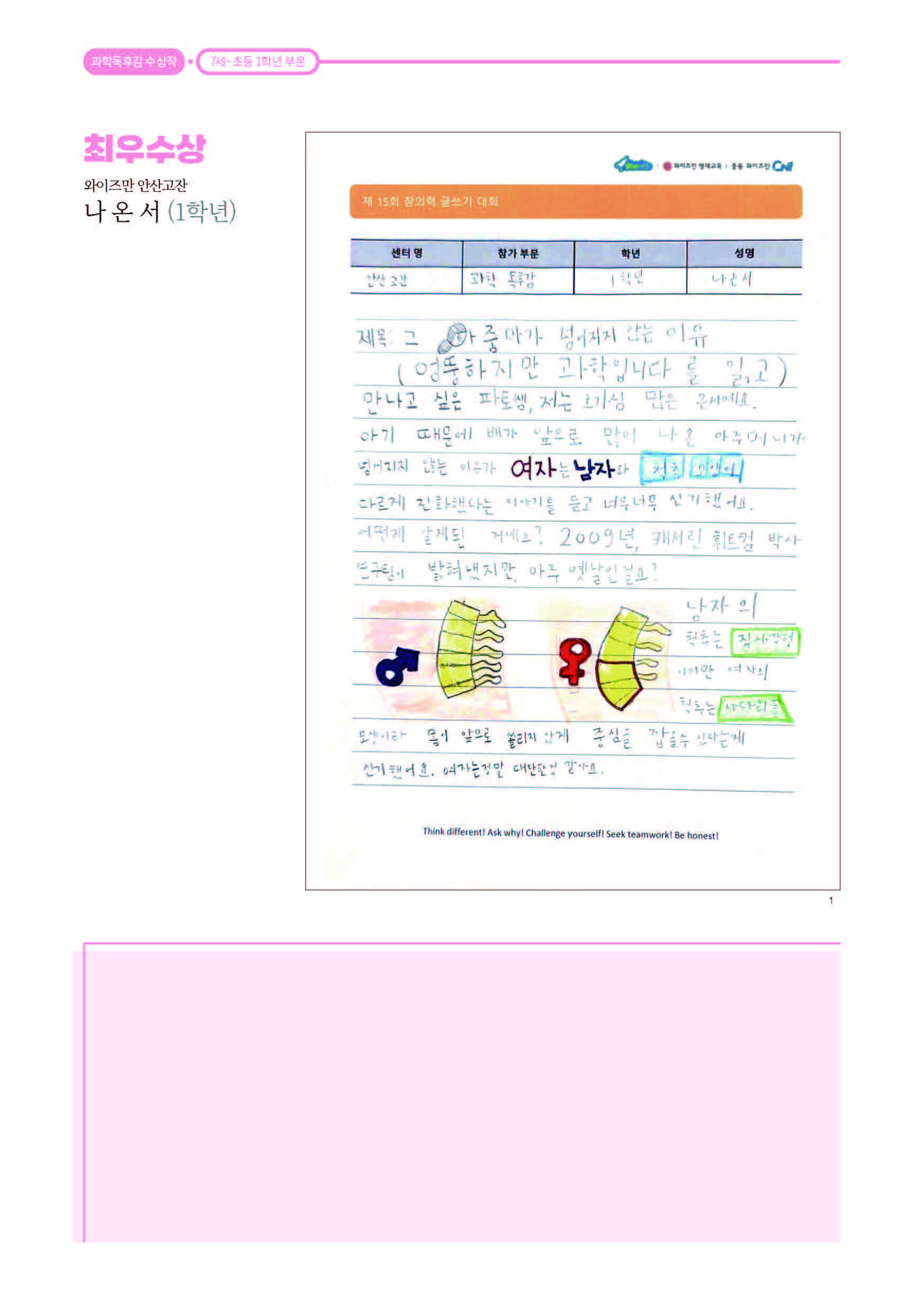 제 15회 창의력 글쓰기 대회 과학 독후감 최우수상 와이즈만 영재교육 안산고잔센터 1학년 나온서