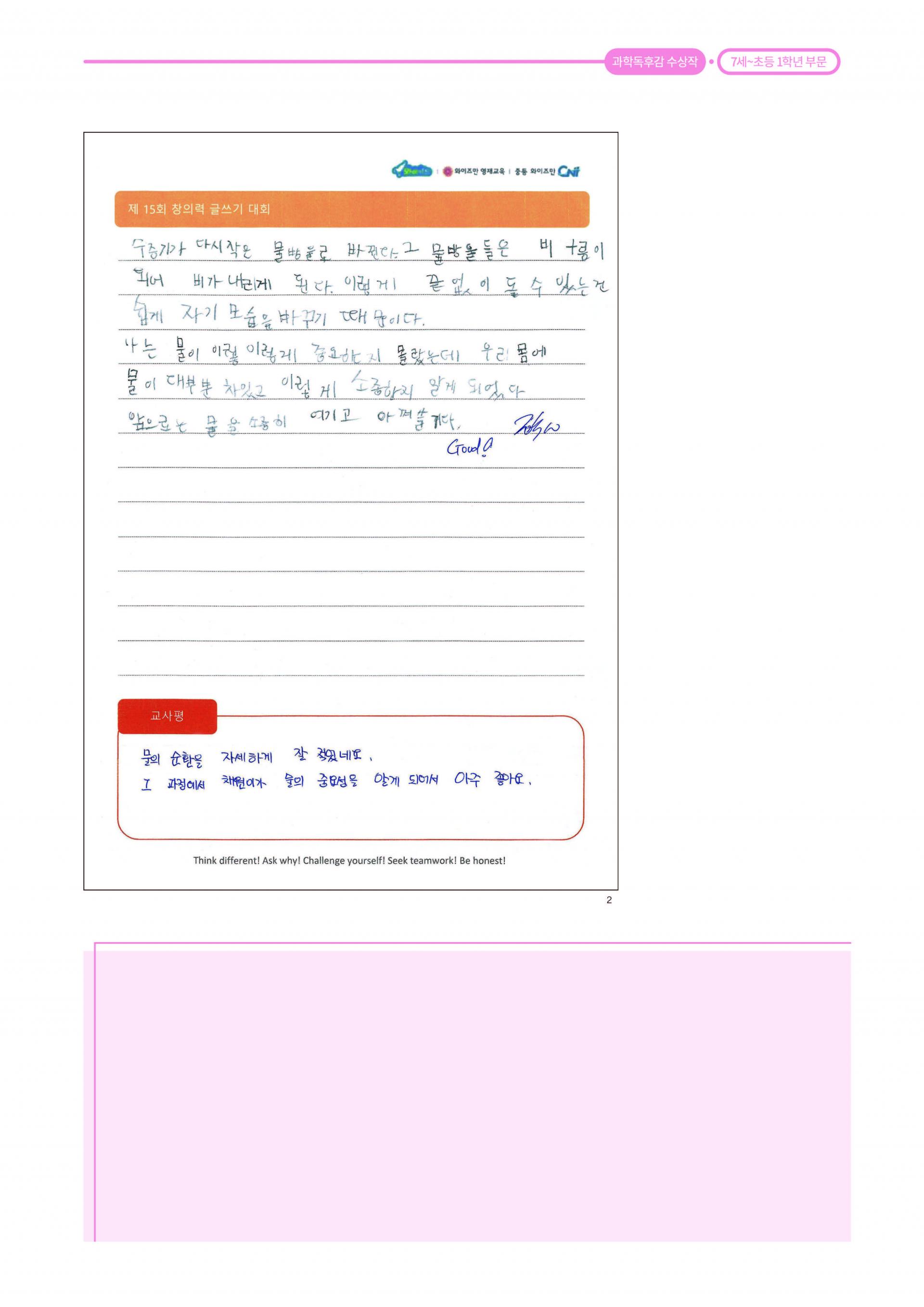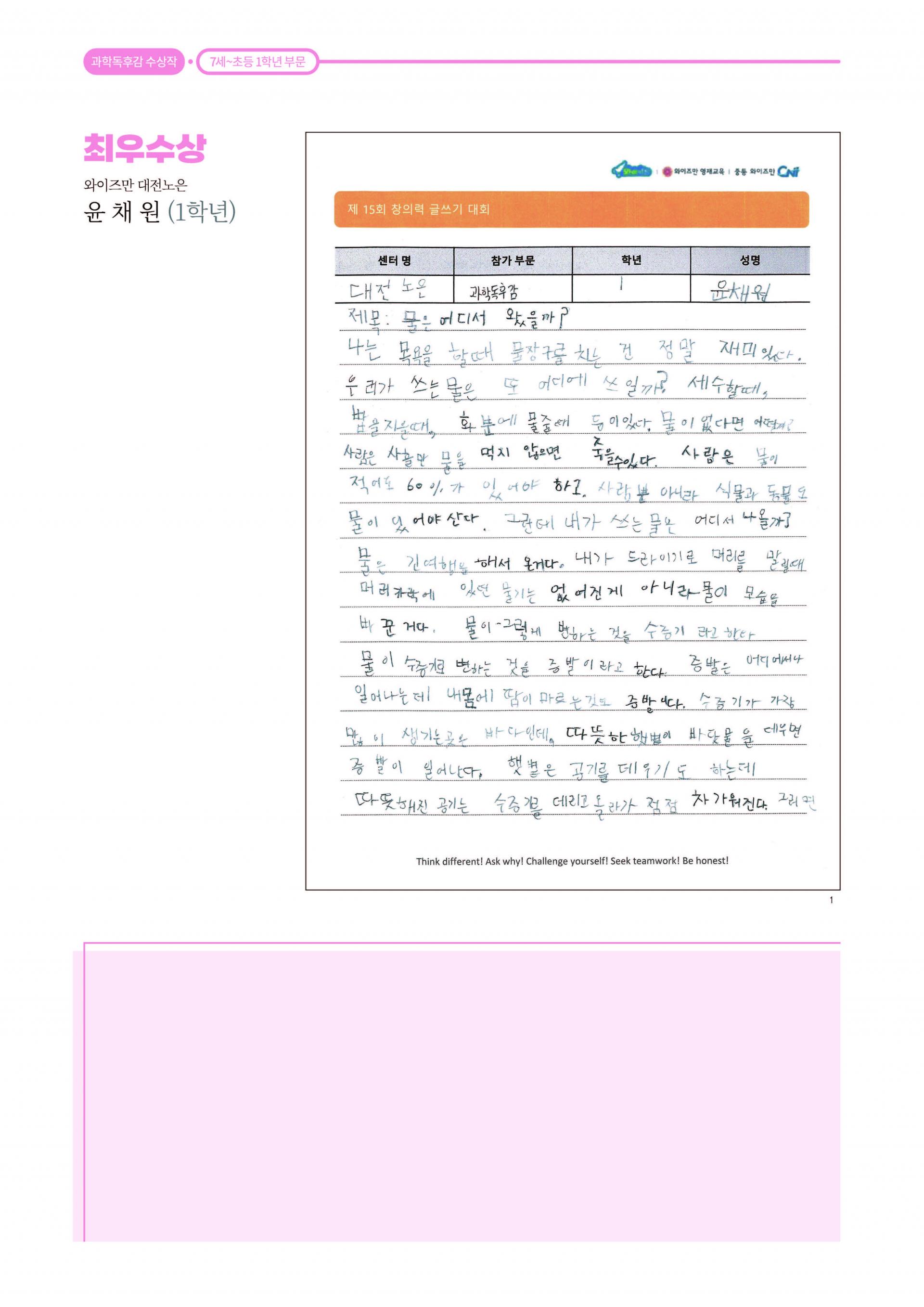 제 15회 창의력 글쓰기 대회 과학 독후감 최우수상 와이즈만 영재교육 대전노은센터 1학년 윤채원