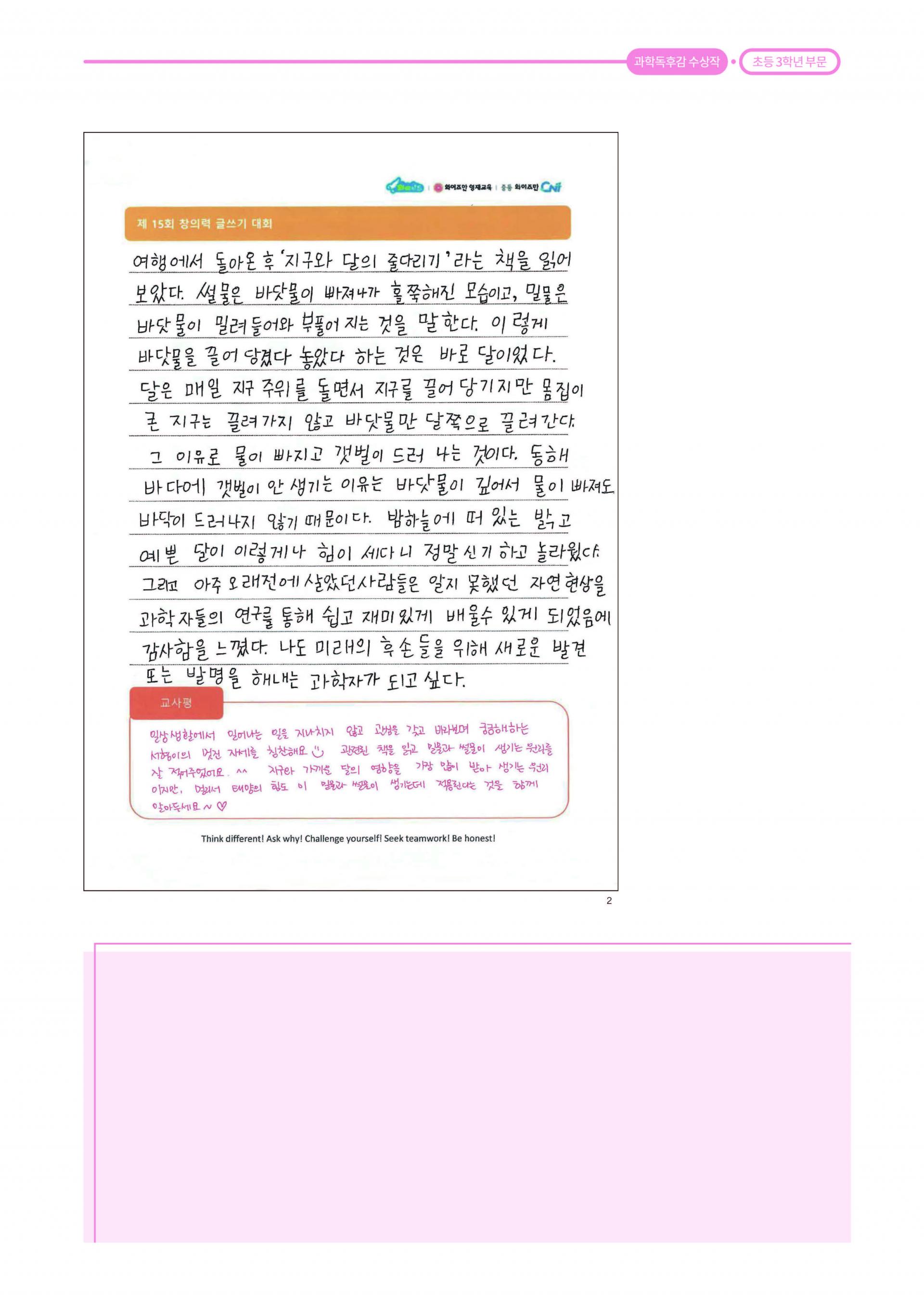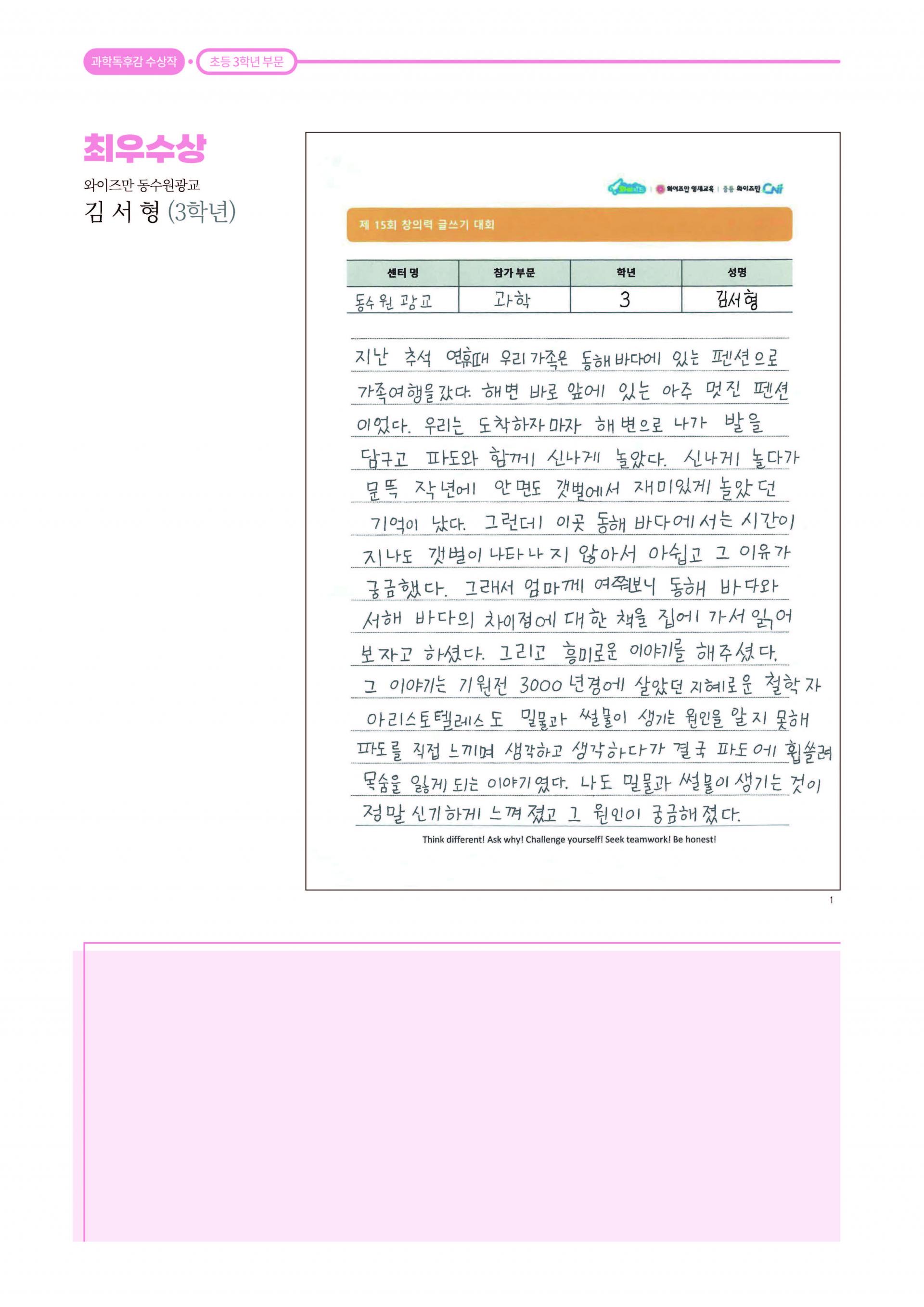 제 15회 창의력 글쓰기 대회 과학 독후감 최우수상 와이즈만 영재교육 동수원광교센터 3학년 김서형
