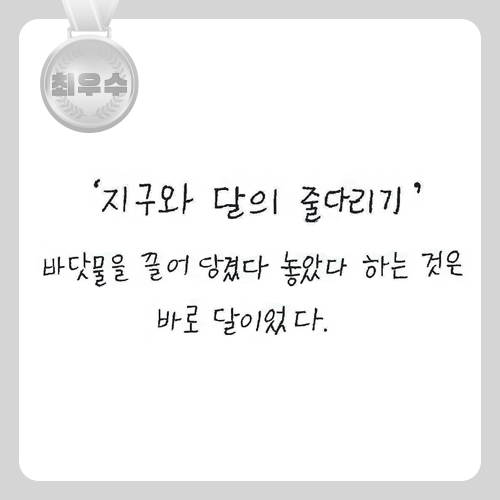 동해 바다에 갯벌이 안 생기는 이유는 바닷물이 깊어서 물이 빠져도 바닥이 드러나지 않기 때문이다. 밤하늘에 떠 있는 밝고 예쁜 달이 이렇게나 힘이 세다니 정말 신기하고 놀라웠다. 그리고 아주 오래전에 살았던 사람들은 알지 못했던 자연 현상을 과학자들의 연구를 통해 쉽고 재미있게 배울 수 있게 되었음에 감사함을 느꼈다. 나도 미래의 후손들을 위해 새로운 발견 또는 발명을 해내는 과학자가 되고 싶다.