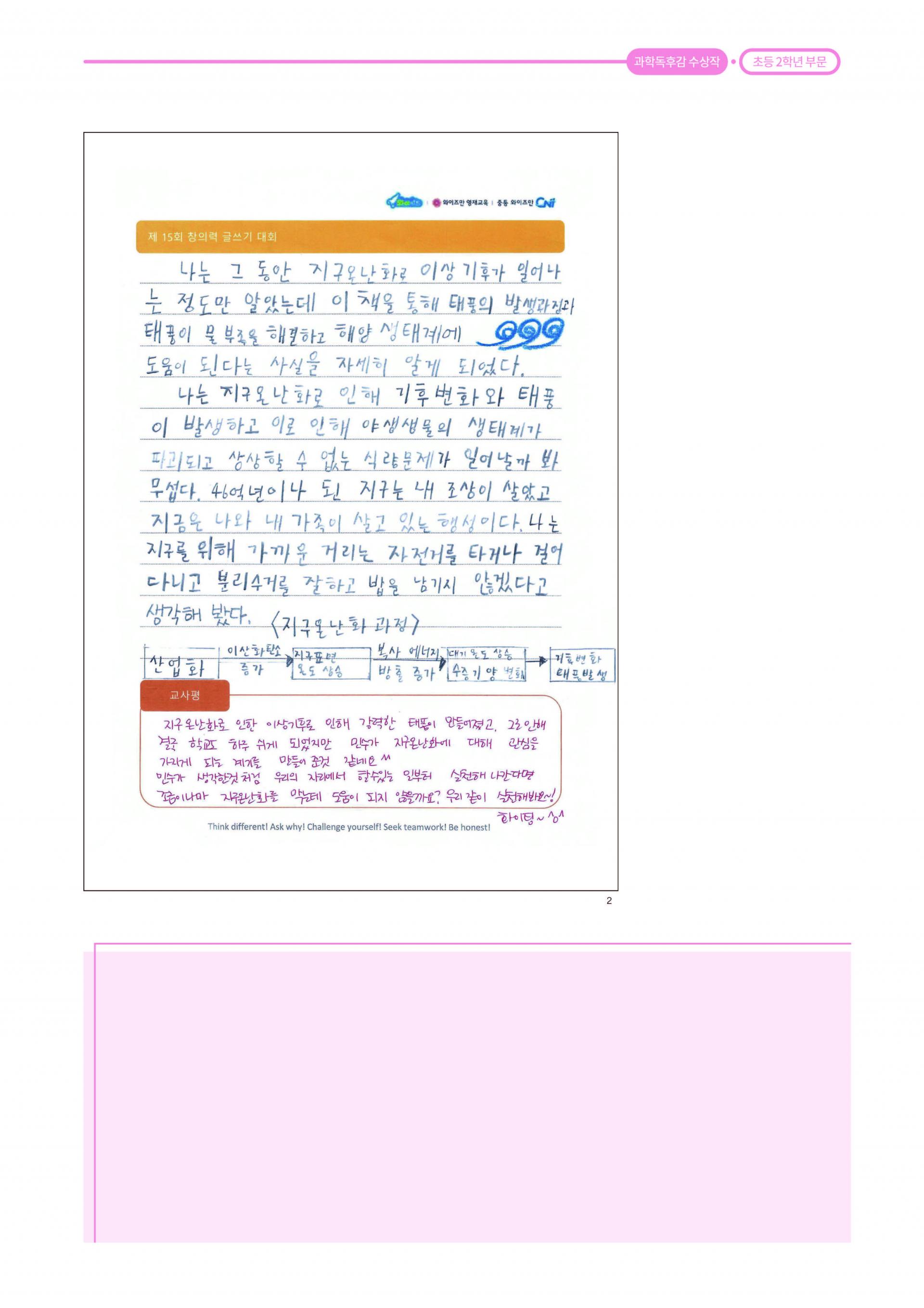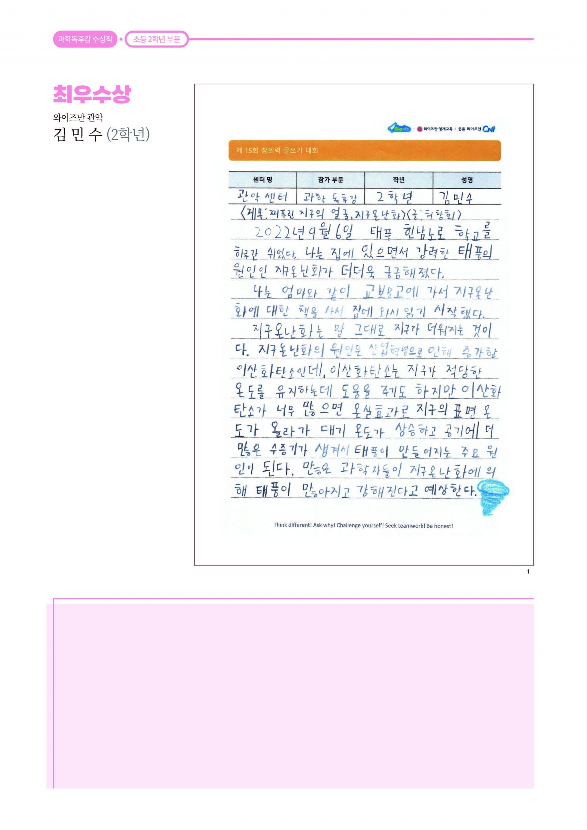 제 15회 창의력 글쓰기 대회 과학 독후감 최우수상 와이즈만 영재교육 관악센터 2학년 김민수