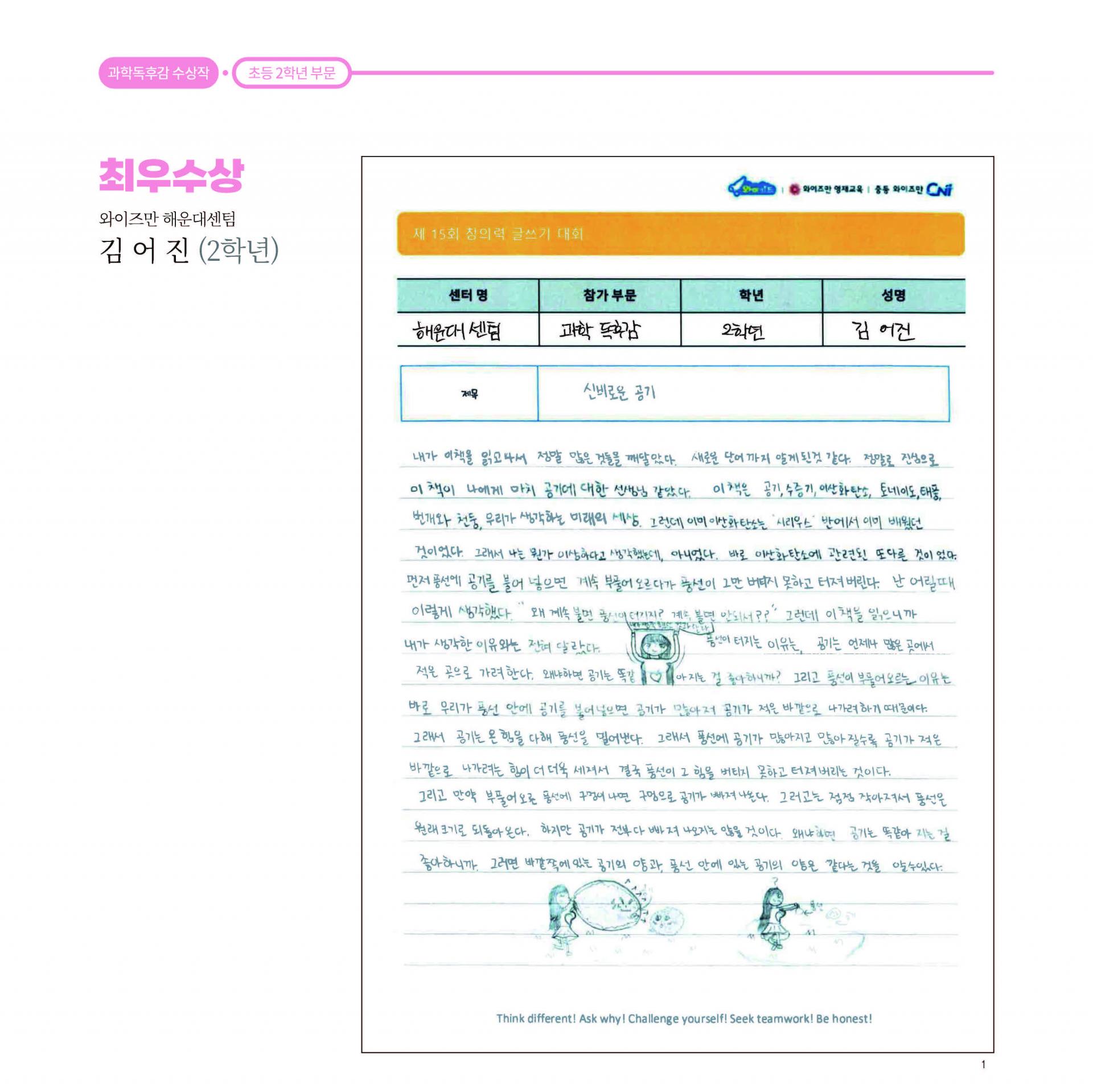 제 15회 창의력 글쓰기 대회 과학 독후감 최우수상 와이즈만 영재교육 해운대센텀센터 2학년 김어진
