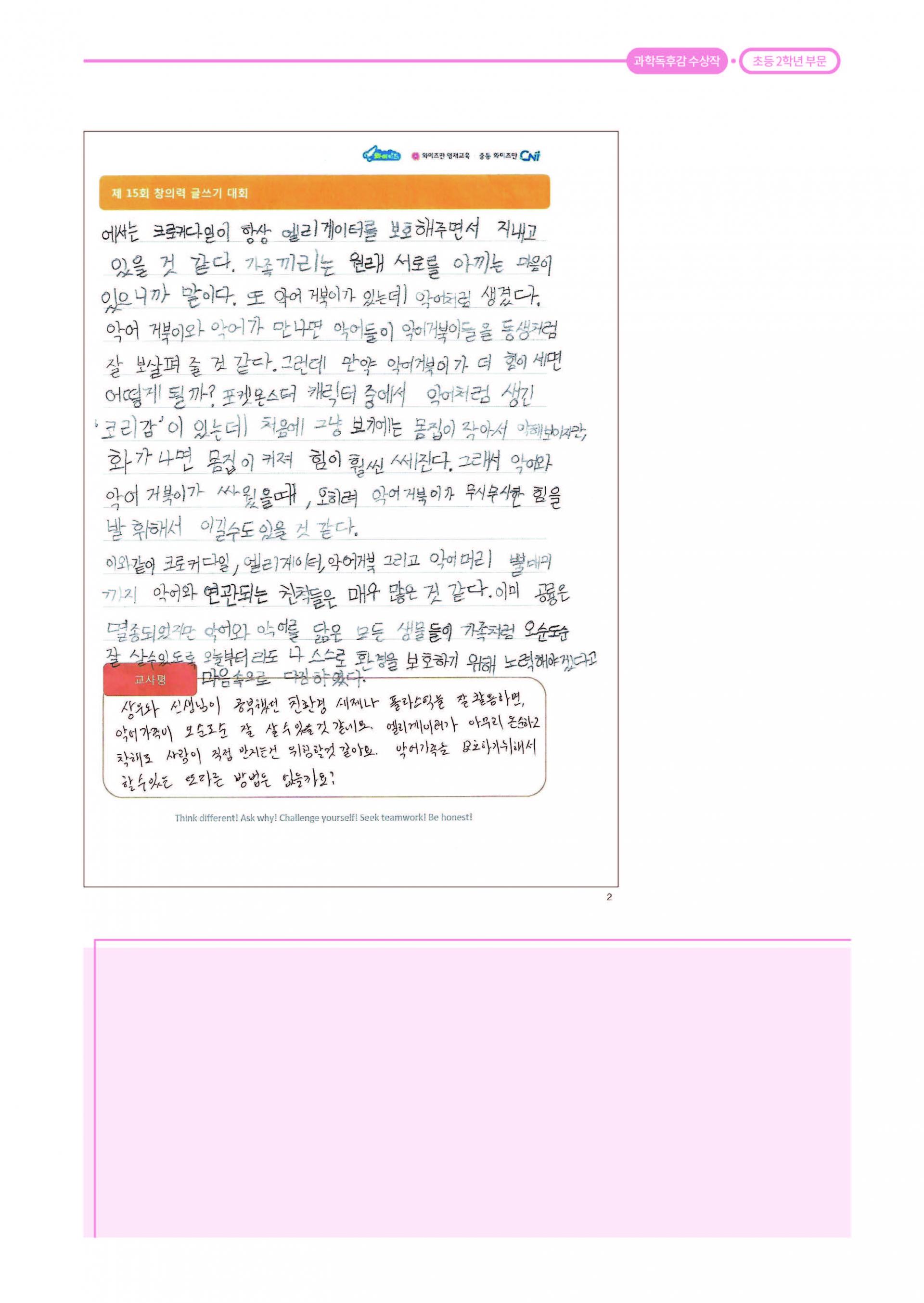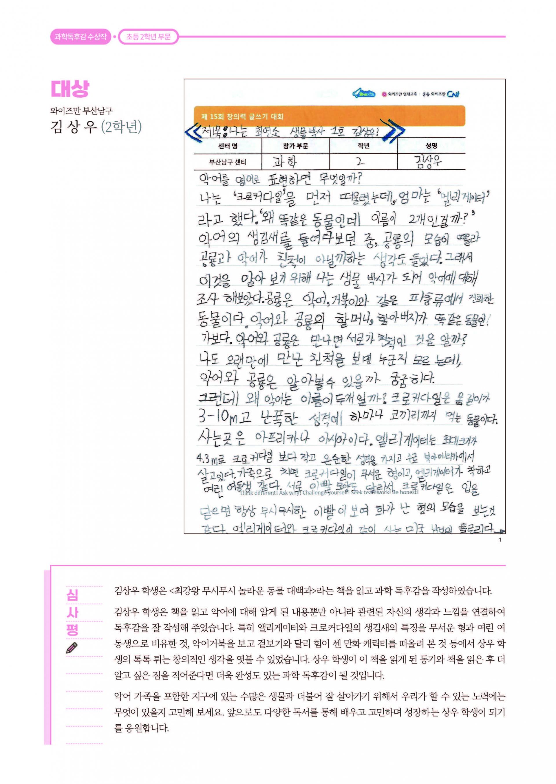 제 15회 창의력 글쓰기 대회 과학독후감 대상 와이즈만 영재교육 부산남구센터 2학년 김상우